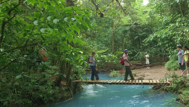 Rio Celeste Tour from La Fortuna, Arenal Volcano. we will leave La fortuna at 7:30 AM on one of the most interesting adventures in the region.The whole journey to village of Guatuzo it is about 1 hour and 30 minutes and we will get to the trail head at 9:00 AM and start our one and a half mile hike to the magical waters of Rio Celeste. Rio Celeste consist of two pristine brooks that meet forming the perfect chemistry delighting us with heavently colored waters that gives the rivers it is name.